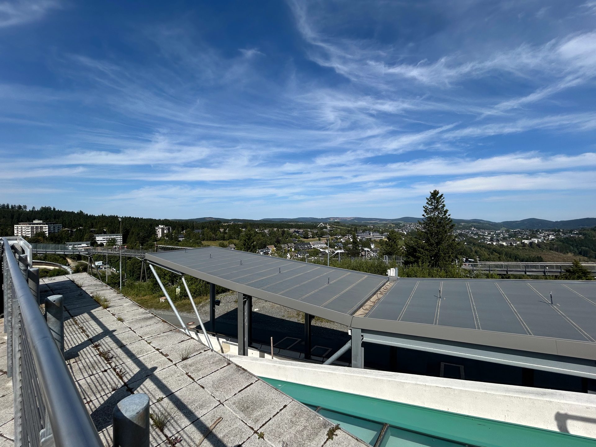 Obwohl es warm ist, zieht ein kühler Wind durch den Startbereich. Vor uns öffnet sich ein spektakulärer Blick ins Tal – und die 1.600 Meter lange Bobbahn liegt da wie ein Tunnel in eine andere Welt.